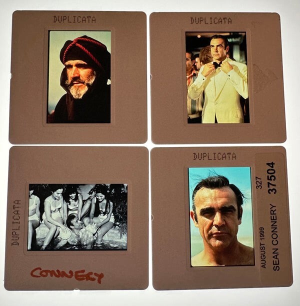 Sean Connery Collection of 20 Vintage Photo Agency 35mm Transparency Slides including Diamonds Are Frever, A Bridge Too Far, Never say Never Again and candids. This is a vintage photo Agency duplicate 35mm color transparency, derived directly from the original camera transparency, so ensuring sharp detail and vivid color. The photo Agencies produced very few duplicates, which were sent out to magazines and publications for publishing. This is a real collector's item and would make superb quality photographs or prints. This would also be a great addition to any collection or image archive. This color transparency is in Excellent condition. This collector's item is being sold from one collector to another, no rights are given or implied. Silver Screen Mementos are gradually releasing from their vast archives thousands of original photographs, transparencies, negatives, slides, lobby cards and other movie or television memorabilia.