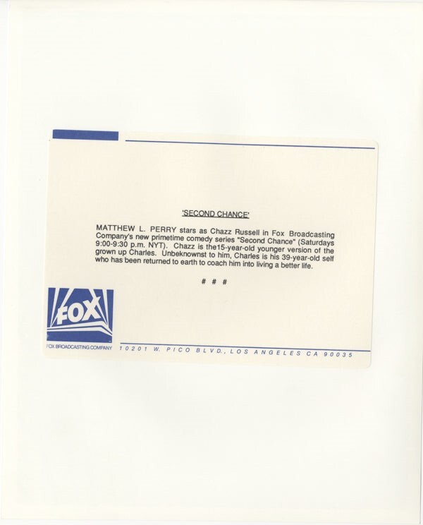 Matthew Perry 1987 Second Chance Portrait Original 8x10 Photo with Fox snipe Near Mint Condition This item is an ORIGINAL 8x10 photo from the historic archives of Silver Screen Mementos. This original photograph was made in the actual year the film, television show or event was produced. The movie studios produced publicity photographs for distribution to the press, photo agencies and publicity departments to advertise the film/tv show or event. Very often original photos have press release information on the reverse of the photo - movie credits, description of the scene, event and people involved. This is a historic piece of cinema art and is being offered from one collector to another, no rights given or implied. Silver Screen are gradually releasing thousands of Original Photographs, Transparencies, Negatives, Lobby Cards, Posters, Magazines and other memorabilia from our historic archive.