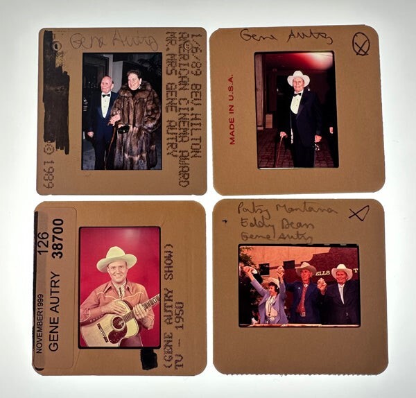 Gene Autry Western Film Cowboy Collection Lot of 16 Original 35mm Transparency Slides including candids and one photo agency re-release portrait. This is an original studio or photographer's 35 mm color slide transparency from our historic archive. This is a real collector's item and would make superb quality photographs or prints. This would also be a great addition to any collection or image archive. This original color slide transparency is in Excellent condition. This collector's item is being sold from one collector to another, no rights are given or implied. Silver Screen Mementos are gradually releasing from their vast archives thousands of original photographs, transparencies, negatives, slides, lobby cards and other movie or television memorabilia.