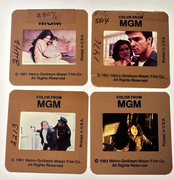 A Stranger is Watching 1981 Kate Mulgrew Rip Torn Lot of 10 Original 35mm Transparency Slides This is an original studio or photographer's 35 mm color slide transparency from our historic archive. This is a real collector's item and would make superb quality photographs or prints. This would also be a great addition to any collection or image archive. This original color slide transparency is in Excellent condition. This collector's item is being sold from one collector to another, no rights are given or implied. Silver Screen Mementos are gradually releasing from their vast archives thousands of original photographs, transparencies, negatives, slides, lobby cards and other movie or television memorabilia.