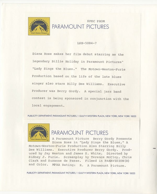 Lady Sings the Blues Diana Ross Singing with Band Original 8x10 Photo with Snipe 1972 Near Mint Condition This item is an ORIGINAL 8x10 photo from the historic archives of Silver Screen Mementos. This original photograph was made in the actual year the film, television show or event was produced. The movie studios produced publicity photographs for distribution to the press, photo agencies and publicity departments to advertise the film/tv show or event. Very often original photos have press release information on the reverse of the photo - movie credits, description of the scene, event and people involved. This is a historic piece of cinema art and is being offered from one collector to another, no rights given or implied. Silver Screen are gradually releasing thousands of Original Photographs, Transparencies, Negatives, Lobby Cards, Posters, Magazines and other memorabilia from our historic archive.