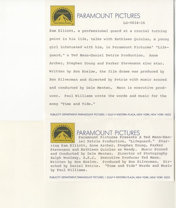 Lifeguard Sam Elliott Kathleen Quinlan wearing bikini Original 8x10 Photo with Snipe 1975 Near Mint Condition This item is an ORIGINAL 8x10 photo from the historic archives of Silver Screen Mementos. This original photograph was made in the actual year the film, television show or event was produced. The movie studios produced publicity photographs for distribution to the press, photo agencies and publicity departments to advertise the film/tv show or event. Very often original photos have press release information on the reverse of the photo - movie credits, description of the scene, event and people involved. This is a historic piece of cinema art and is being offered from one collector to another, no rights given or implied. Silver Screen are gradually releasing thousands of Original Photographs, Transparencies, Negatives, Lobby Cards, Posters, Magazines and other memorabilia from our historic archive.