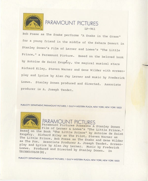 The Little Prince Bob Fosse the Snake wearing Bowler Hat Spats Original 8x10 Photo with Snipe 1974 Near Mint Condition This item is an ORIGINAL 8x10 photo from the historic archives of Silver Screen Mementos. This original photograph was made in the actual year the film, television show or event was produced. The movie studios produced publicity photographs for distribution to the press, photo agencies and publicity departments to advertise the film/tv show or event. Very often original photos have press release information on the reverse of the photo - movie credits, description of the scene, event and people involved. This is a historic piece of cinema art and is being offered from one collector to another, no rights given or implied. Silver Screen are gradually releasing thousands of Original Photographs, Transparencies, Negatives, Lobby Cards, Posters, Magazines and other memorabilia from our historic archive.