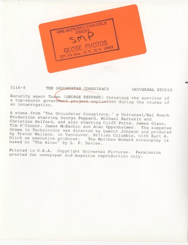 George Peppard 1972 The Groundstar Conspiracy with gun Original 8x10 Photo snipe VG/Near Mint Condition This item is an ORIGINAL 8x10 photo from the historic archives of Silver Screen Mementos. This original photograph was made in the actual year the film, television show or event was produced. The movie studios produced publicity photographs for distribution to the press, photo agencies and publicity departments to advertise the film/tv show or event. Very often original photos have press release information on the reverse of the photo - movie credits, description of the scene, event and people involved. This is a historic piece of cinema art and is being offered from one collector to another, no rights given or implied. Silver Screen are gradually releasing thousands of Original Photographs, Transparencies, Negatives, Lobby Cards, Posters, Magazines and other memorabilia from our historic archive.