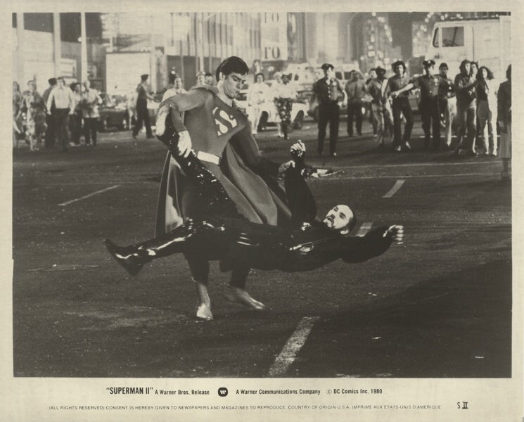Superman 2 Christopher Reeve, Terence Stamp Fight Scene Original 8x10 Photo 1980 Near Mint Condition This item is an ORIGINAL 8x10 photo from the historic archives of Silver Screen Mementos. This original photograph was made in the actual year the film, television show or event was produced. The movie studios produced publicity photographs for distribution to the press, photo agencies and publicity departments to advertise the film/tv show or event. Very often original photos have press release information on the reverse of the photo - movie credits, description of the scene, event and people involved. This is a historic piece of cinema art and is being offered from one collector to another, no rights given or implied. Silver Screen are gradually releasing thousands of Original Photographs, Transparencies, Negatives, Lobby Cards, Posters, Magazines and other memorabilia from our historic archive.