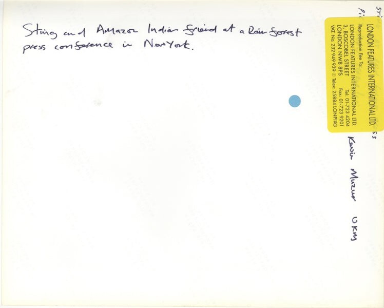 Sting The Police with Amazon Indian Rainforest press conference New York Vintage Stamped 8x10 Photo. Near Mint Condition This is an Original vintage photograph from the year of the concert, photo shoot or event measuring approximately 8x10 inches (20x25 cm) unless otherwise stated. Many Original vintage photographs carry the agency or photographer stamp on the back. This is a rare collectors item being offered from one collector to another, no nights given or implied. Silver Screen are gradually releasing thousands of Original Photographs, Transparencies, Negatives, Lobby Cards, Posters, Magazines and other memorabilia from our historic archive.