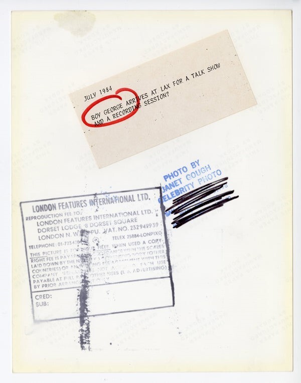 Boy George Culture Club arriving at LAX airport Original 7x9 Photo Stamped with Snipe 1984 VG/Near Mint Condition This is an Original vintage photograph from the year of the concert, photo shoot or event measuring approximately 8x10 inches (20x25 cm) unless otherwise stated. Many Original vintage photographs carry the agency or photographer stamp on the back. This is a rare collectors item being offered from one collector to another, no nights given or implied. Silver Screen are gradually releasing thousands of Original Photographs, Transparencies, Negatives, Lobby Cards, Posters, Magazines and other memorabilia from our historic archive.