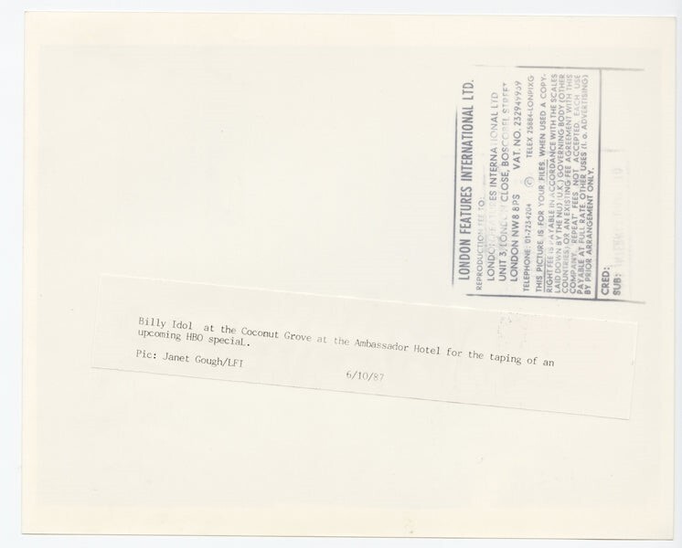 Billy Idol Coconut Grove Ambassador Hotel Los Angeles Tongue Out Thumbs up Pose HBO Special Taping Session Original 8x10 Photo Stamped with Snipe 1987 Near Mint Condition This is an Original vintage photograph from the year of the concert, photo shoot or event measuring approximately 8x10 inches (20x25 cm) unless otherwise stated. Many Original vintage photographs carry the agency or photographer stamp on the back. This is a rare collectors item being offered from one collector to another, no nights given or implied. Silver Screen are gradually releasing thousands of Original Photographs, Transparencies, Negatives, Lobby Cards, Posters, Magazines and other memorabilia from our historic archive.
