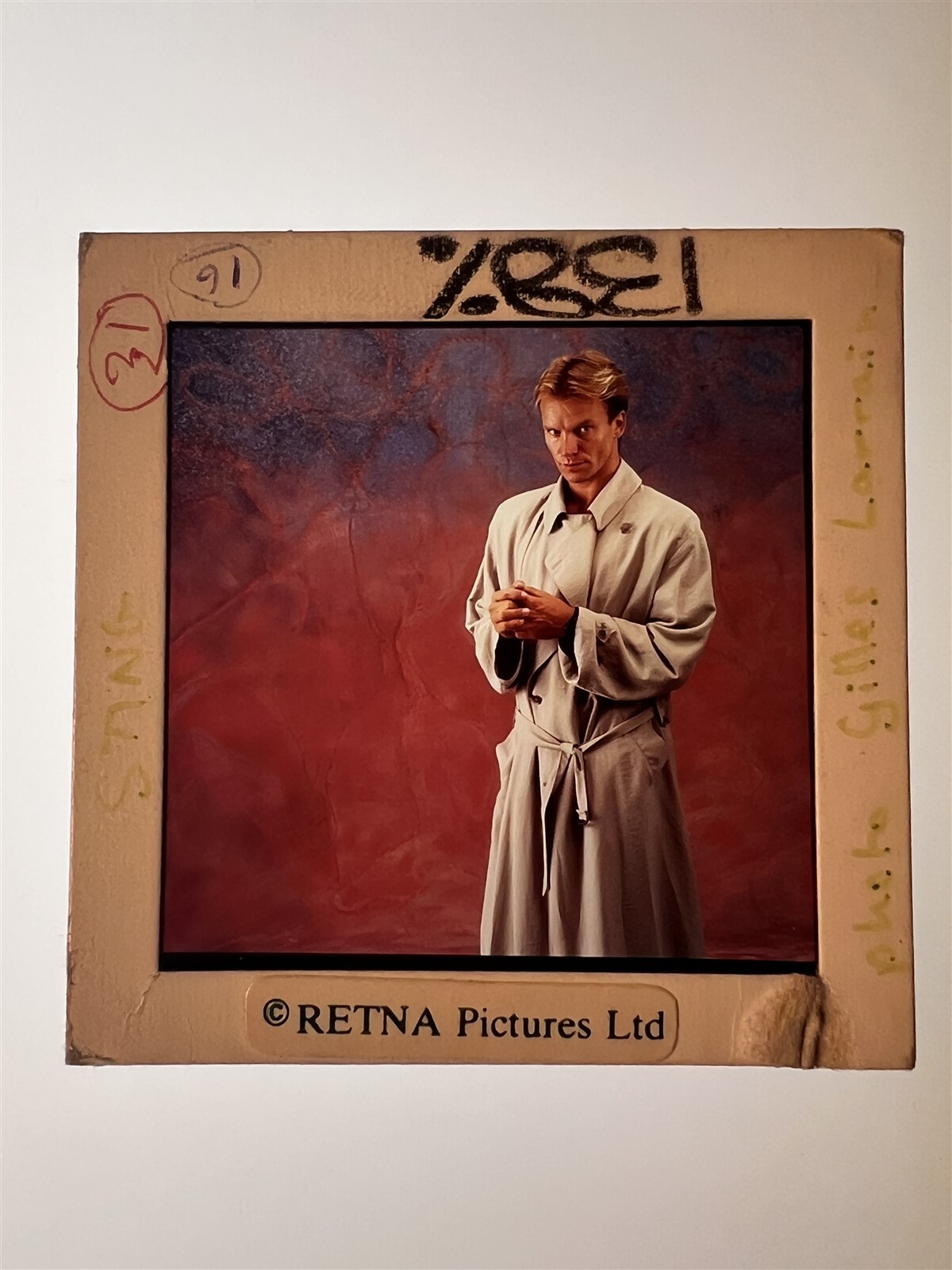 Sting The Police 1980's iconic Photo Shoot in trenchcoat Original 2.25 x 2.25 Transparency in stamped mountThis is an original studio or photographer's 2.25 x 2.25 inches color slide transparency from our historic archive. This is a real collector's item and would make superb quality photographs or prints. This would also be a great addition to any collection or image archive. This original color slide transparency is in Excellent condition. This collector's item is being sold from one collector to another, no rights are given or implied. Silver Screen Mementos are gradually releasing from their vast archives thousands of original photographs, transparencies, negatives, slides, lobby cards and other movie or television memorabilia.