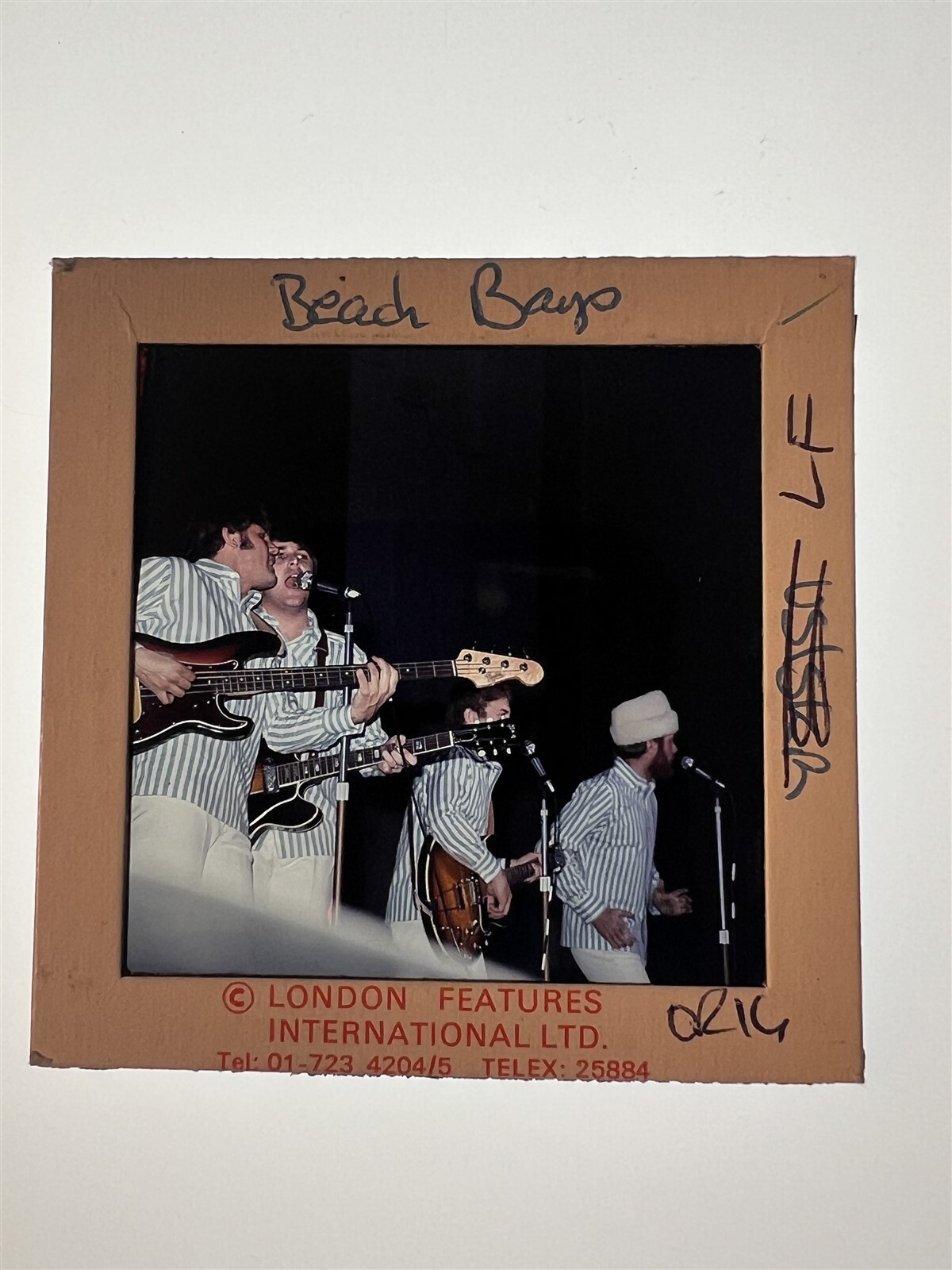 The Beach Boys vintage concert rare Original 2.25 x 2.25 Transparency This is an original studio or photographer's 2.25 x 2.25 inches color slide transparency from our historic archive. This is a real collector's item and would make superb quality photographs or prints. This would also be a great addition to any collection or image archive. This original color slide transparency is in Excellent condition. This collector's item is being sold from one collector to another, no rights are given or implied. Silver Screen Mementos are gradually releasing from their vast archives thousands of original photographs, transparencies, negatives, slides, lobby cards and other movie or television memorabilia.