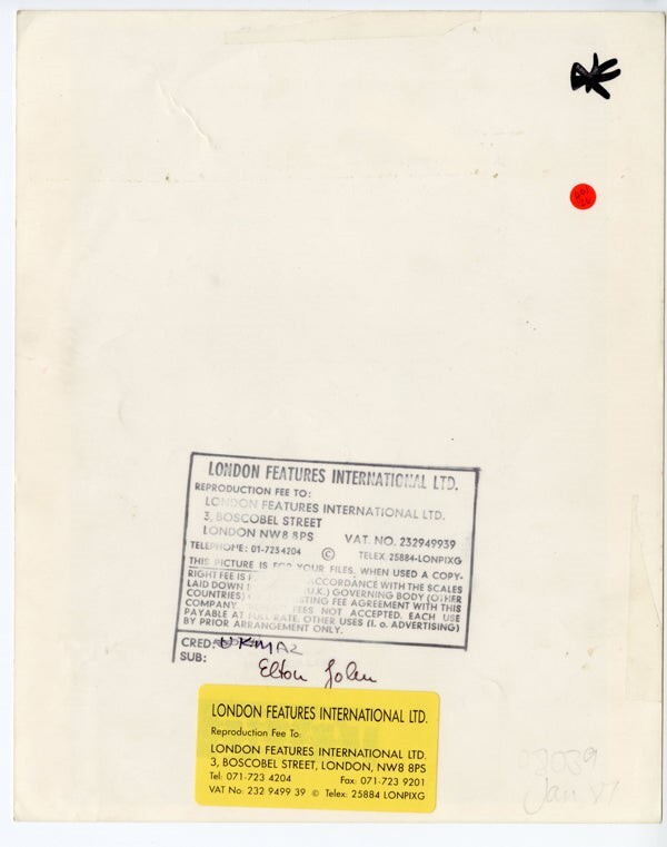 Elton John in concert straw boater hat bow tie Original 8x10 Photo Stamped Good/VG (creases, surface marks) This is an Original vintage photograph from the year of the concert, photo shoot or event measuring approximately 8x10 inches (20x25 cm) unless otherwise stated. Many Original vintage photographs carry the agency or photographer stamp on the back. This is a rare collectors item being offered from one collector to another, no nights given or implied. Silver Screen are gradually releasing thousands of Original Photographs, Transparencies, Negatives, Lobby Cards, Posters, Magazines and other memorabilia from our historic archive.