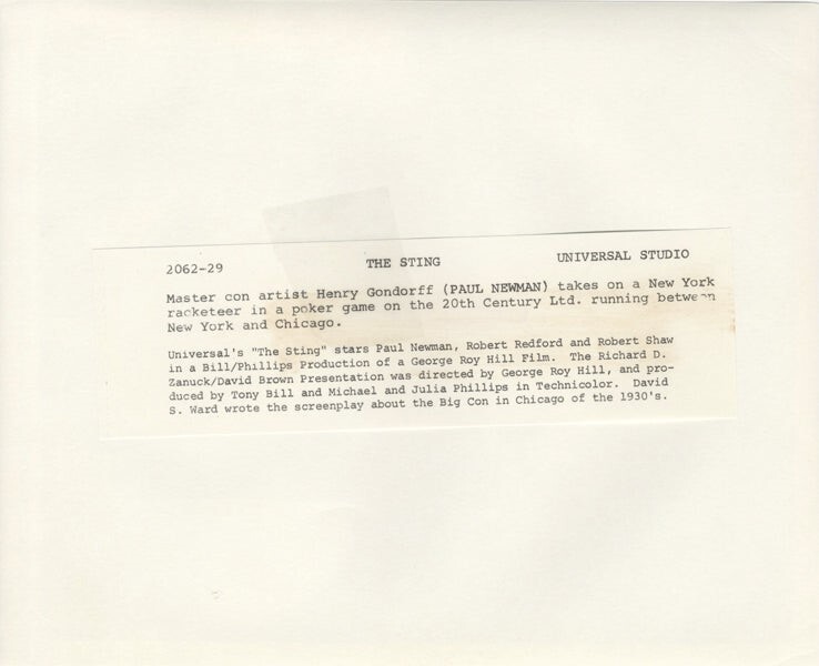 The Sting 1973 Paul Newman Con Man Close up Portrait Original 8x10 Photo Snipe VG/Near Mint Condition This item is an ORIGINAL 8x10 photo from the historic archives of Silver Screen Mementos. This original photograph was made in the actual year the film, television show or event was produced. The movie studios produced publicity photographs for distribution to the press, photo agencies and publicity departments to advertise the film/tv show or event. Very often original photos have press release information on the reverse of the photo - movie credits, description of the scene, event and people involved. This is a historic piece of cinema art and is being offered from one collector to another, no rights given or implied. Silver Screen are gradually releasing thousands of Original Photographs, Transparencies, Negatives, Lobby Cards, Posters, Magazines and other memorabilia from our historic archive.