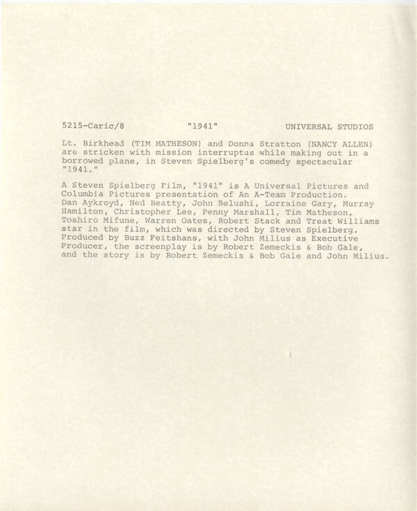 1941 Tim Matheson, Nancy Allen Movie Poster Artwork Original 8x10 Photo with Snipe 1979 VG/Near Mint Condition This item is an ORIGINAL 8x10 photo from the historic archives of Silver Screen Mementos. This original photograph was made in the actual year the film, television show or event was produced. The movie studios produced publicity photographs for distribution to the press, photo agencies and publicity departments to advertise the film/tv show or event. Very often original photos have press release information on the reverse of the photo - movie credits, description of the scene, event and people involved. This is a historic piece of cinema art and is being offered from one collector to another, no rights given or implied. Silver Screen are gradually releasing thousands of Original Photographs, Transparencies, Negatives, Lobby Cards, Posters, Magazines and other memorabilia from our historic archive.
