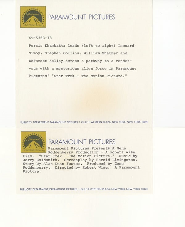 Star Trek The Motion Picture William Shatner, DeForest Kelley, Leonard Nimoy, Stephen Collins, Persis Khambatta Original 8x10 Photo wiht Snipe 1979 Near Mint Condition This item is an ORIGINAL 8x10 photo from the historic archives of Silver Screen Mementos. This original photograph was made in the actual year the film, television show or event was produced. The movie studios produced publicity photographs for distribution to the press, photo agencies and publicity departments to advertise the film/tv show or event. Very often original photos have press release information on the reverse of the photo - movie credits, description of the scene, event and people involved. This is a historic piece of cinema art and is being offered from one collector to another, no rights given or implied. Silver Screen are gradually releasing thousands of Original Photographs, Transparencies, Negatives, Lobby Cards, Posters, Magazines and other memorabilia from our historic archive.