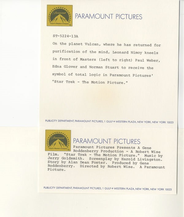 Star Trek the Motion Picture Leonard Nimoy, Paul Weber, Edna Glover, Norman Stuart Original 8x10 Photo with Snipe 1979 Near Mint Condition This item is an ORIGINAL 8x10 photo from the historic archives of Silver Screen Mementos. This original photograph was made in the actual year the film, television show or event was produced. The movie studios produced publicity photographs for distribution to the press, photo agencies and publicity departments to advertise the film/tv show or event. Very often original photos have press release information on the reverse of the photo - movie credits, description of the scene, event and people involved. This is a historic piece of cinema art and is being offered from one collector to another, no rights given or implied. Silver Screen are gradually releasing thousands of Original Photographs, Transparencies, Negatives, Lobby Cards, Posters, Magazines and other memorabilia from our historic archive.
