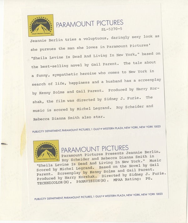 Sheila Levine is Dead Living in New York, Jeannie Berlin Original 8x10 Photo with Snipe 1974 Near Mint Condition This item is an ORIGINAL 8x10 photo from the historic archives of Silver Screen Mementos. This original photograph was made in the actual year the film, television show or event was produced. The movie studios produced publicity photographs for distribution to the press, photo agencies and publicity departments to advertise the film/tv show or event. Very often original photos have press release information on the reverse of the photo - movie credits, description of the scene, event and people involved. This is a historic piece of cinema art and is being offered from one collector to another, no rights given or implied. Silver Screen are gradually releasing thousands of Original Photographs, Transparencies, Negatives, Lobby Cards, Posters, Magazines and other memorabilia from our historic archive.