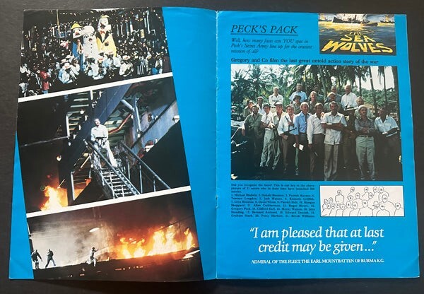 The Sea Wolves 1980 Original UK Movie Pressbook Gregory Peck Roger Moore 8 pages color photos and features on the movie in VG Condition A movie pressbook is a promotional tool used by film studios and distributors to advertise and market a movie before its release. It's essentially a booklet or a package containing various materials like synopsis, promotional images, posters, advertising materials, cast and crew information, suggested promotional strategies, and more. These pressbooks were produced in very low quantities and distributed to theater owners and exhibitors to assist them in promoting the film in their localities. They were valuable because they provided crucial information and materials necessary for the marketing and promotion of the movie. Pressbooks often contained suggestions for marketing strategies, including how to display posters, design newspaper ads, and generate interest in the film within the local community.Today, movie pressbooks have become collector's items due to their historical significance and rarity. They offer insights into the marketing and promotional strategies of films from different eras, making them valuable for movie enthusiasts, collectors, historians, and even those interested in advertising and marketing history. The scarcity of these items, especially for older or iconic films, contributes to their value among collectors and enthusiasts of cinema memorabilia.A real Collectors’ item being released from our historic archives, this is a complete vintage magazine. Silver Screen Mementos are gradually releasing from their vast archives thousands of original photographs, transparencies, negatives, slides, lobby cards, magazines, brochures, press books and other movie or television memorabilia.