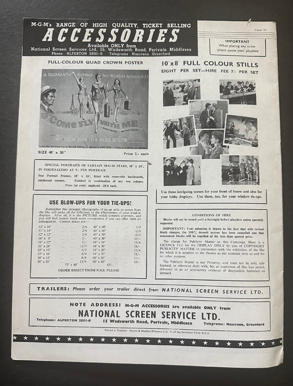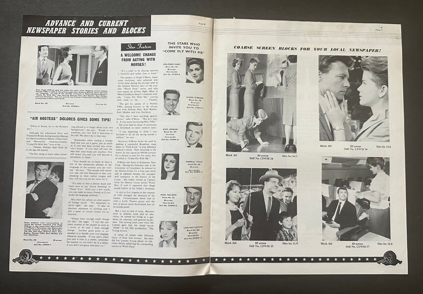 Come Fly With Me 1963 Original Movie Pressbook UK Delores Hart Pamela Tiffin Hugh O'Brian 12 pages measuring approx 10x13 inches in VG/Near Mint Condition A movie pressbook is a promotional tool used by film studios and distributors to advertise and market a movie before its release. It's essentially a booklet or a package containing various materials like synopsis, promotional images, posters, advertising materials, cast and crew information, suggested promotional strategies, and more. These pressbooks were produced in very low quantities and distributed to theater owners and exhibitors to assist them in promoting the film in their localities. They were valuable because they provided crucial information and materials necessary for the marketing and promotion of the movie. Pressbooks often contained suggestions for marketing strategies, including how to display posters, design newspaper ads, and generate interest in the film within the local community.Today, movie pressbooks have become collector's items due to their historical significance and rarity. They offer insights into the marketing and promotional strategies of films from different eras, making them valuable for movie enthusiasts, collectors, historians, and even those interested in advertising and marketing history. The scarcity of these items, especially for older or iconic films, contributes to their value among collectors and enthusiasts of cinema memorabilia.A real Collectors’ item being released from our historic archives, this is a complete vintage magazine. Silver Screen Mementos are gradually releasing from their vast archives thousands of original photographs, transparencies, negatives, slides, lobby cards, magazines, brochures, press books and other movie or television memorabilia.