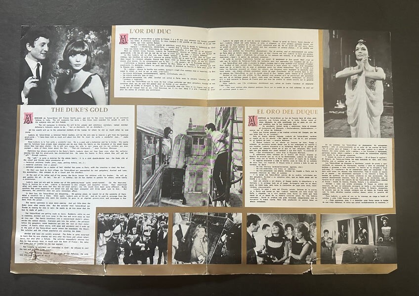 L'or du duc 1965 Jacques Baratier Original Movie Pressbook French film starring Elsa Martinelli, Danielle Darrieux and Pierre Brasseur very rare UK promotional foldout campaign pressbook containing movie art, photos and features measuring approx 10x13 inches in Good Condition (some edge wear at bottom)A movie pressbook is a promotional tool used by film studios and distributors to advertise and market a movie before its release. It's essentially a booklet or a package containing various materials like synopsis, promotional images, posters, advertising materials, cast and crew information, suggested promotional strategies, and more. These pressbooks were produced in very low quantities and distributed to theater owners and exhibitors to assist them in promoting the film in their localities. They were valuable because they provided crucial information and materials necessary for the marketing and promotion of the movie. Pressbooks often contained suggestions for marketing strategies, including how to display posters, design newspaper ads, and generate interest in the film within the local community.Today, movie pressbooks have become collector's items due to their historical significance and rarity. They offer insights into the marketing and promotional strategies of films from different eras, making them valuable for movie enthusiasts, collectors, historians, and even those interested in advertising and marketing history. The scarcity of these items, especially for older or iconic films, contributes to their value among collectors and enthusiasts of cinema memorabilia.A real Collectors’ item being released from our historic archives, this is a complete vintage magazine. Silver Screen Mementos are gradually releasing from their vast archives thousands of original photographs, transparencies, negatives, slides, lobby cards, magazines, brochures, press books and other movie or television memorabilia.