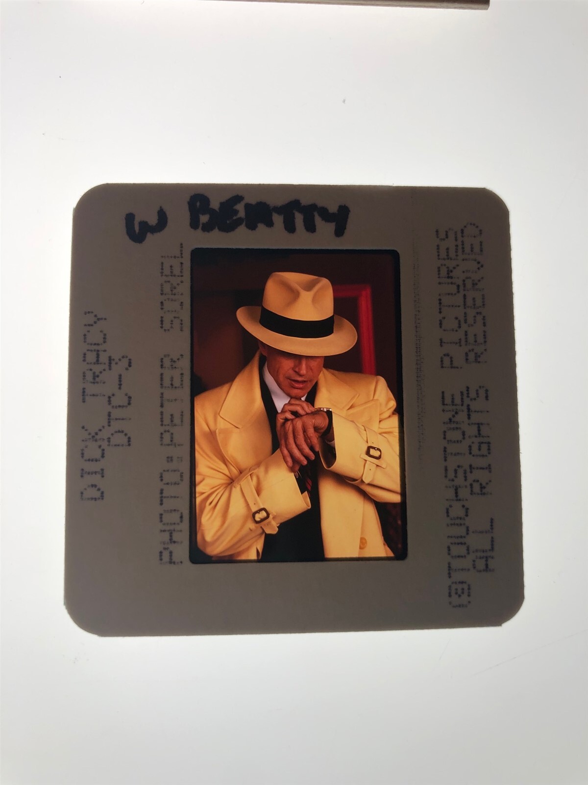 Warren Beatty Dick Tracy wearing Yellow Fedora Trenchcoat checking wristwatch Original 35mm Transparency Stamped Mount 1990This is an original studio or photographer's 35 mm color slide transparency from our historic archive. This is a real collector's item and would make superb quality photographs or prints. This would also be a great addition to any collection or image archive. This original color slide transparency is in Excellent condition. This collector's item is being sold from one collector to another, no rights are given or implied. Silver Screen Mementos are gradually releasing from their vast archives thousands of original photographs, transparencies, negatives, slides, lobby cards and other movie or television memorabilia.