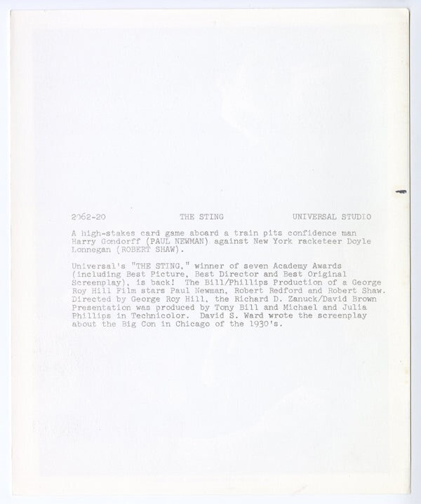 The Sting Paul Newman, Robert Shaw playing poker smoking cigar Original 8x10 Photo with Snipe 1973 Near Mint Condition This item is an ORIGINAL 8x10 photo from the historic archives of Silver Screen Mementos. This original photograph was made in the actual year the film, television show or event was produced. The movie studios produced publicity photographs for distribution to the press, photo agencies and publicity departments to advertise the film/tv show or event. Very often original photos have press release information on the reverse of the photo - movie credits, description of the scene, event and people involved. This is a historic piece of cinema art and is being offered from one collector to another, no rights given or implied. Silver Screen are gradually releasing thousands of Original Photographs, Transparencies, Negatives, Lobby Cards, Posters, Magazines and other memorabilia from our historic archive.