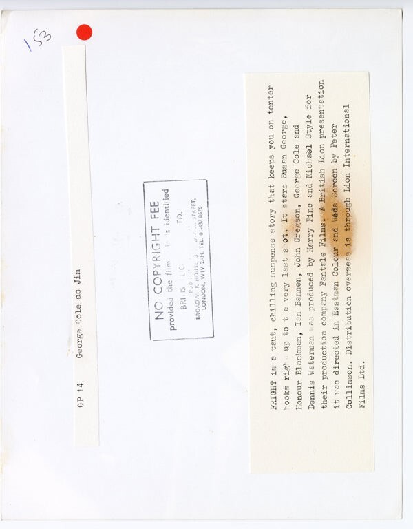 George Cole Close up Fright Cult Horror Original 8x10 Photo Stamped Snipe 1971 Near Mint Condition This item is an ORIGINAL 8x10 photo from the historic archives of Silver Screen Mementos. This original photograph was made in the actual year the film, television show or event was produced. The movie studios produced publicity photographs for distribution to the press, photo agencies and publicity departments to advertise the film/tv show or event. Very often original photos have press release information on the reverse of the photo - movie credits, description of the scene, event and people involved. This is a historic piece of cinema art and is being offered from one collector to another, no rights given or implied. Silver Screen are gradually releasing thousands of Original Photographs, Transparencies, Negatives, Lobby Cards, Posters, Magazines and other memorabilia from our historic archive.