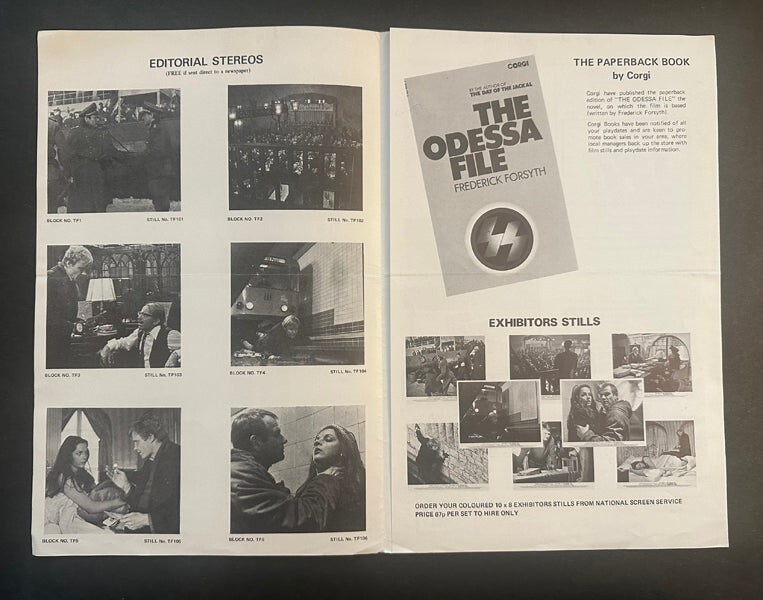 The Odessa File 1974 Original UK Pressbook Jon Voight featuring Poster art photos articlesA movie pressbook is a promotional tool used by film studios and distributors to advertise and market a movie before its release. It's essentially a booklet or a package containing various materials like synopsis, promotional images, posters, advertising materials, cast and crew information, suggested promotional strategies, and more. These pressbooks were produced in very low quantities and distributed to theater owners and exhibitors to assist them in promoting the film in their localities. They were valuable because they provided crucial information and materials necessary for the marketing and promotion of the movie. Pressbooks often contained suggestions for marketing strategies, including how to display posters, design newspaper ads, and generate interest in the film within the local community.Today, movie pressbooks have become collector's items due to their historical significance and rarity. They offer insights into the marketing and promotional strategies of films from different eras, making them valuable for movie enthusiasts, collectors, historians, and even those interested in advertising and marketing history. The scarcity of these items, especially for older or iconic films, contributes to their value among collectors and enthusiasts of cinema memorabilia.A real Collectors’ item being released from our historic archives, this is a complete vintage magazine. Silver Screen Mementos are gradually releasing from their vast archives thousands of original photographs, transparencies, negatives, slides, lobby cards, magazines, brochures, press books and other movie or television memorabilia.
