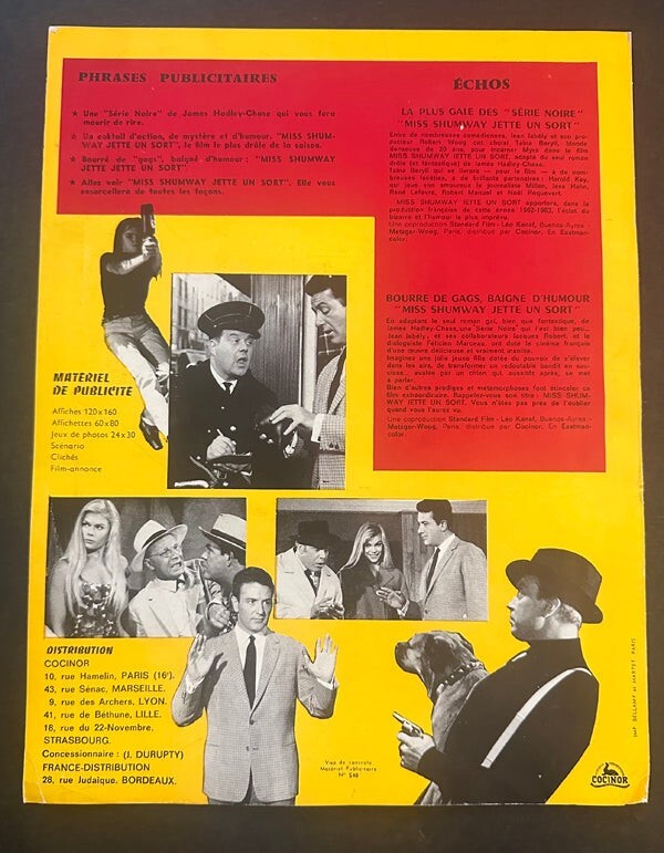 Miss Shumway Jette Un Sort Original French Pressbook Taina Beryll Harold Kay featuring photos and info from the French film A movie pressbook is a promotional tool used by film studios and distributors to advertise and market a movie before its release. It's essentially a booklet or a package containing various materials like synopsis, promotional images, posters, advertising materials, cast and crew information, suggested promotional strategies, and more. These pressbooks were produced in very low quantities and distributed to theater owners and exhibitors to assist them in promoting the film in their localities. They were valuable because they provided crucial information and materials necessary for the marketing and promotion of the movie. Pressbooks often contained suggestions for marketing strategies, including how to display posters, design newspaper ads, and generate interest in the film within the local community.Today, movie pressbooks have become collector's items due to their historical significance and rarity. They offer insights into the marketing and promotional strategies of films from different eras, making them valuable for movie enthusiasts, collectors, historians, and even those interested in advertising and marketing history. The scarcity of these items, especially for older or iconic films, contributes to their value among collectors and enthusiasts of cinema memorabilia.A real Collectors’ item being released from our historic archives, this is a complete vintage magazine. Silver Screen Mementos are gradually releasing from their vast archives thousands of original photographs, transparencies, negatives, slides, lobby cards, magazines, brochures, press books and other movie or television memorabilia.