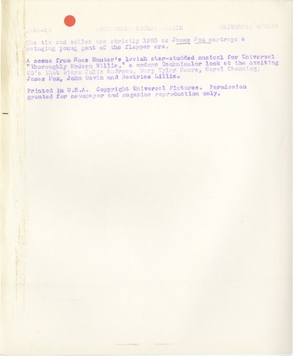James Fox Thoroughly Modern Millie 1967 Close up Portrait Original 8x10 Photo with Snipe VG/Near Mint Condition This item is an ORIGINAL 8x10 photo from the historic archives of Silver Screen Mementos. This original photograph was made in the actual year the film, television show or event was produced. The movie studios produced publicity photographs for distribution to the press, photo agencies and publicity departments to advertise the film/tv show or event. Very often original photos have press release information on the reverse of the photo - movie credits, description of the scene, event and people involved. This is a historic piece of cinema art and is being offered from one collector to another, no rights given or implied. Silver Screen are gradually releasing thousands of Original Photographs, Transparencies, Negatives, Lobby Cards, Posters, Magazines and other memorabilia from our historic archive.