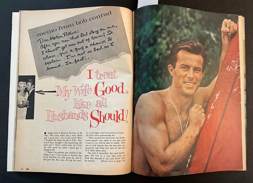 Motion Picture Magazine Doris Day Cover Sepember 1961 also featuring Tuesday Weld, Robert Conrad ,Tab Hunter and Elvis Presley etc. A real Collectors’ item being released from our historic archives, this is a complete vintage magazine. Silver Screen Mementos are gradually releasing from their vast archives thousands of original photographs, transparencies, negatives, slides, lobby cards, magazines, brochures, press books and other movie or television memorabilia. This collector's item is being sold from one collector to another, no rights are given or implied. Silver Screen Mementos are gradually releasing from their vast archives thousands of original photographs, transparencies, negatives, slides, lobby cards and other movie or television memorabilia.