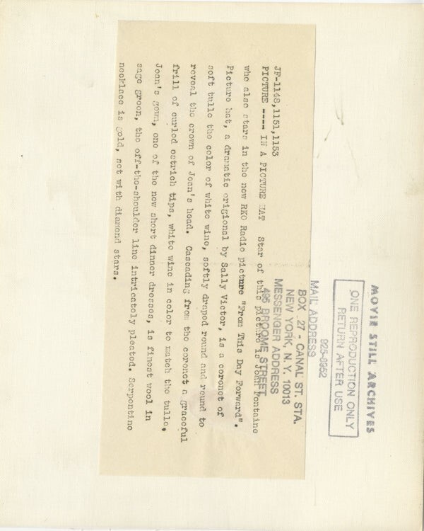 Joan Fontaine From This Day Forward 1946 Striking Ostrich Feather Glamour Hat Sally Victor design Original Double Weight Silver Gelatin 8x10 Photo with Snipe Near Mint This item is an ORIGINAL 8x10 photo from the historic archives of Silver Screen Mementos. This original photograph was made in the actual year the film, television show or event was produced. The movie studios produced publicity photographs for distribution to the press, photo agencies and publicity departments to advertise the film/tv show or event. Very often original photos have press release information on the reverse of the photo - movie credits, description of the scene, event and people involved. This is a historic piece of cinema art and is being offered from one collector to another, no rights given or implied. Silver Screen are gradually releasing thousands of Original Photographs, Transparencies, Negatives, Lobby Cards, Posters, Magazines and other memorabilia from our historic archive.