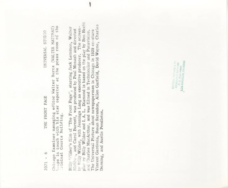Walter Matthau The Front Page talking on Candlestick Phone Original 8x10 Photo with Snipe 1974 VG/Near Mint Condition This item is an ORIGINAL 8x10 photo from the historic archives of Silver Screen Mementos. This original photograph was made in the actual year the film, television show or event was produced. The movie studios produced publicity photographs for distribution to the press, photo agencies and publicity departments to advertise the film/tv show or event. Very often original photos have press release information on the reverse of the photo - movie credits, description of the scene, event and people involved. This is a historic piece of cinema art and is being offered from one collector to another, no rights given or implied. Silver Screen are gradually releasing thousands of Original Photographs, Transparencies, Negatives, Lobby Cards, Posters, Magazines and other memorabilia from our historic archive.
