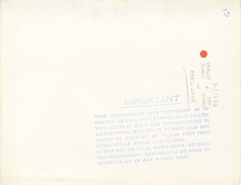 April Love Shirley Jones Pat Boone tender embrace Original 8x10 Photo Stamped 1957 VG Condition This item is an ORIGINAL 8x10 photo from the historic archives of Silver Screen Mementos. This original photograph was made in the actual year the film, television show or event was produced. The movie studios produced publicity photographs for distribution to the press, photo agencies and publicity departments to advertise the film/tv show or event. Very often original photos have press release information on the reverse of the photo - movie credits, description of the scene, event and people involved. This is a historic piece of cinema art and is being offered from one collector to another, no rights given or implied. Silver Screen are gradually releasing thousands of Original Photographs, Transparencies, Negatives, Lobby Cards, Posters, Magazines and other memorabilia from our historic archive.