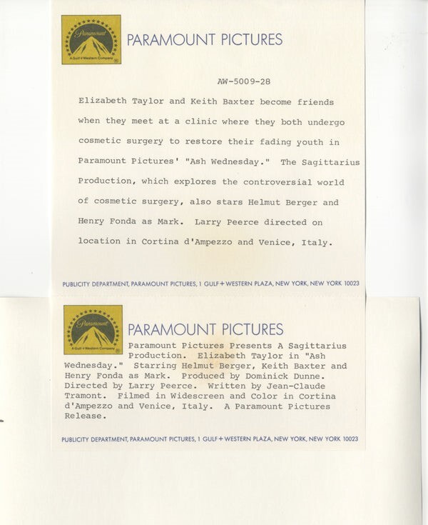 Ash Wednesday Drama Film Elizabeth Taylor Keith Baxter Original 8x10 Photo 1973 with snipe Near Mint This item is an ORIGINAL 8x10 photo from the historic archives of Silver Screen Mementos. This original photograph was made in the actual year the film, television show or event was produced. The movie studios produced publicity photographs for distribution to the press, photo agencies and publicity departments to advertise the film/tv show or event. Very often original photos have press release information on the reverse of the photo - movie credits, description of the scene, event and people involved. This is a historic piece of cinema art and is being offered from one collector to another, no rights given or implied. Silver Screen are gradually releasing thousands of Original Photographs, Transparencies, Negatives, Lobby Cards, Posters, Magazines and other memorabilia from our historic archive.