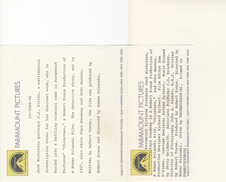 Chinatown Jack Nicolson 1974 Original 8x10 Photo with paper caption snipe Near Mint Condition This item is an ORIGINAL 8x10 photo from the historic archives of Silver Screen Mementos. This original photograph was made in the actual year the film, television show or event was produced. The movie studios produced publicity photographs for distribution to the press, photo agencies and publicity departments to advertise the film/tv show or event. Very often original photos have press release information on the reverse of the photo - movie credits, description of the scene, event and people involved. This is a historic piece of cinema art and is being offered from one collector to another, no rights given or implied. Silver Screen are gradually releasing thousands of Original Photographs, Transparencies, Negatives, Lobby Cards, Posters, Magazines and other memorabilia from our historic archive.