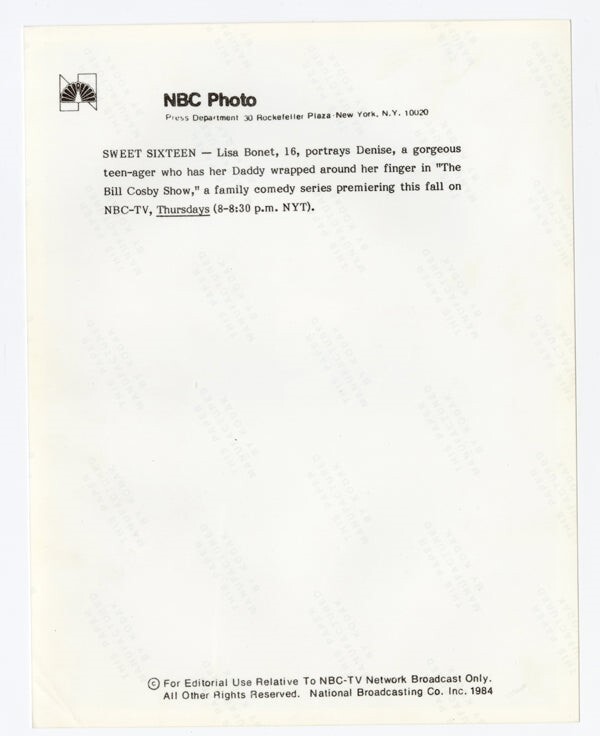 Lisa Bonet The Cosby Show Teen Glamour Close up Original 7x9 Photo Stamped with Snipe 1984 Near Mint Condition This item is an ORIGINAL 8x10 photo from the historic archives of Silver Screen Mementos. This original photograph was made in the actual year the film, television show or event was produced. The movie studios produced publicity photographs for distribution to the press, photo agencies and publicity departments to advertise the film/tv show or event. Very often original photos have press release information on the reverse of the photo - movie credits, description of the scene, event and people involved. This is a historic piece of cinema art and is being offered from one collector to another, no rights given or implied. Silver Screen are gradually releasing thousands of Original Photographs, Transparencies, Negatives, Lobby Cards, Posters, Magazines and other memorabilia from our historic archive.