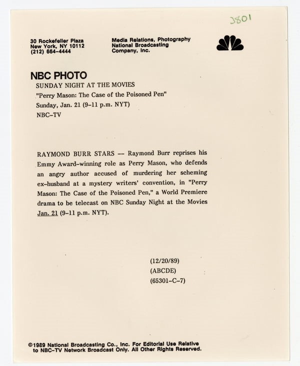 Raymond Burr Perry Mason The Case of the Poisoned Pen Original 7x9 Photo NBC Stamped with Snipe 1989 Near Mint Condition This item is an ORIGINAL 8x10 photo from the historic archives of Silver Screen Mementos. This original photograph was made in the actual year the film, television show or event was produced. The movie studios produced publicity photographs for distribution to the press, photo agencies and publicity departments to advertise the film/tv show or event. Very often original photos have press release information on the reverse of the photo - movie credits, description of the scene, event and people involved. This is a historic piece of cinema art and is being offered from one collector to another, no rights given or implied. Silver Screen are gradually releasing thousands of Original Photographs, Transparencies, Negatives, Lobby Cards, Posters, Magazines and other memorabilia from our historic archive.