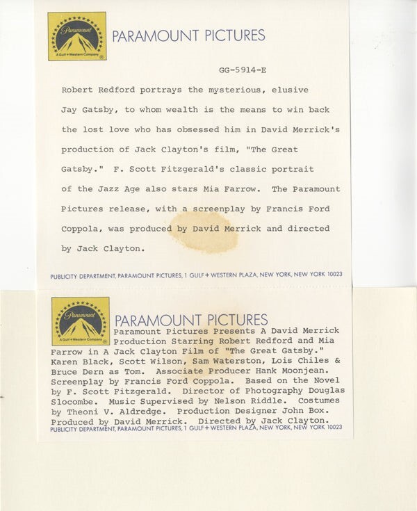 The Great Gatsby Robert Redford Close up Scene Original 8x10 Photo with Snipe 1974 Near Mint Condition This item is an ORIGINAL 8x10 photo from the historic archives of Silver Screen Mementos. This original photograph was made in the actual year the film, television show or event was produced. The movie studios produced publicity photographs for distribution to the press, photo agencies and publicity departments to advertise the film/tv show or event. Very often original photos have press release information on the reverse of the photo - movie credits, description of the scene, event and people involved. This is a historic piece of cinema art and is being offered from one collector to another, no rights given or implied. Silver Screen are gradually releasing thousands of Original Photographs, Transparencies, Negatives, Lobby Cards, Posters, Magazines and other memorabilia from our historic archive.
