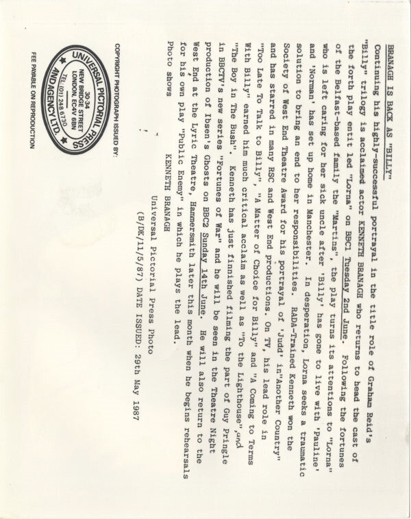 Kenneth Branagh Billy Trilogy Publicity Portrait Original 8x10 Photo Stamped with Snipe 1987 Near Mint Condition This item is an ORIGINAL 8x10 photo from the historic archives of Silver Screen Mementos. This original photograph was made in the actual year the film, television show or event was produced. The movie studios produced publicity photographs for distribution to the press, photo agencies and publicity departments to advertise the film/tv show or event. Very often original photos have press release information on the reverse of the photo - movie credits, description of the scene, event and people involved. This is a historic piece of cinema art and is being offered from one collector to another, no rights given or implied. Silver Screen are gradually releasing thousands of Original Photographs, Transparencies, Negatives, Lobby Cards, Posters, Magazines and other memorabilia from our historic archive.