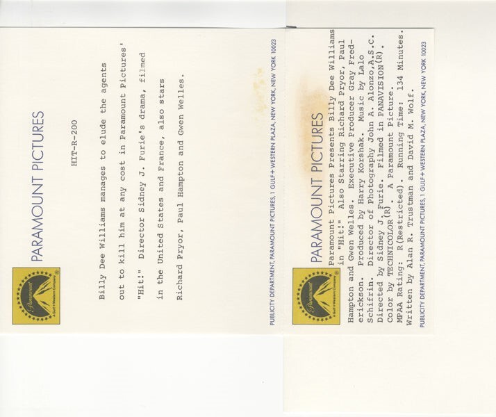 Billy Dee Williams Hit! Agent holding Machine Gun Blaxploitation Original 8x10 Photo with Snipe 1973 Near Mint Condition This item is an ORIGINAL 8x10 photo from the historic archives of Silver Screen Mementos. This original photograph was made in the actual year the film, television show or event was produced. The movie studios produced publicity photographs for distribution to the press, photo agencies and publicity departments to advertise the film/tv show or event. Very often original photos have press release information on the reverse of the photo - movie credits, description of the scene, event and people involved. This is a historic piece of cinema art and is being offered from one collector to another, no rights given or implied. Silver Screen are gradually releasing thousands of Original Photographs, Transparencies, Negatives, Lobby Cards, Posters, Magazines and other memorabilia from our historic archive.
