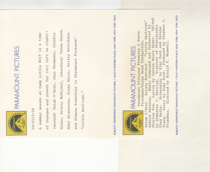 Little Darlings Tatum O'Neal, Kristy McNichol, Jenn Thompson, Cynthia Nixon, Troas Hayes, Abby Bluestone, Alexa Kenin, Krista Errickson, Simone Schachter, Girl Campers Original Photo with Snipe 1980 Near MInt Condition This item is an ORIGINAL 8x10 photo from the historic archives of Silver Screen Mementos. This original photograph was made in the actual year the film, television show or event was produced. The movie studios produced publicity photographs for distribution to the press, photo agencies and publicity departments to advertise the film/tv show or event. Very often original photos have press release information on the reverse of the photo - movie credits, description of the scene, event and people involved. This is a historic piece of cinema art and is being offered from one collector to another, no rights given or implied. Silver Screen are gradually releasing thousands of Original Photographs, Transparencies, Negatives, Lobby Cards, Posters, Magazines and other memorabilia from our historic archive.