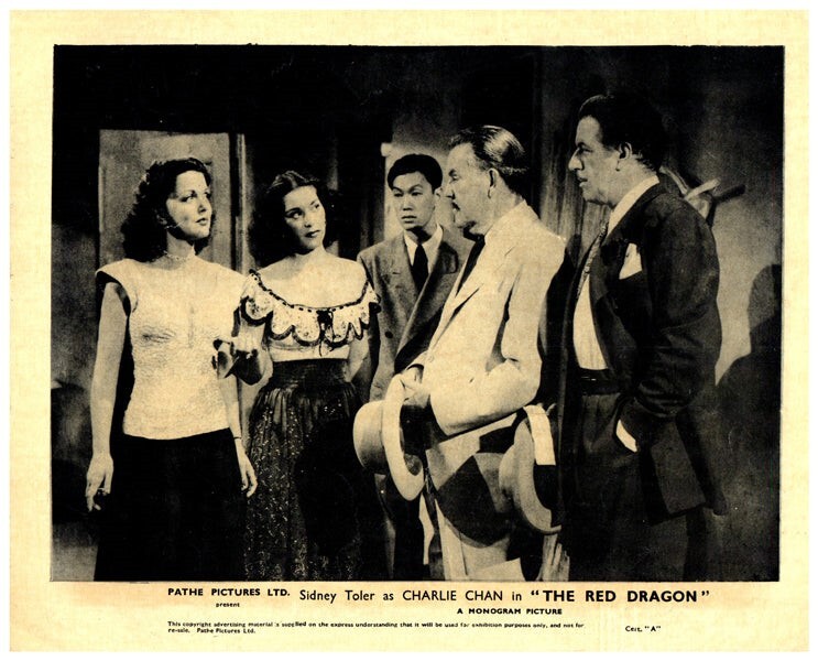 The Red Dragon 1945 Original Lobby Card Sidney Toler, Benson Fong VG Condition Silver Screen Mementos are pleased to be able to offer this authentic original Lobby Card measuring 8x10 inches. This lobby card is from Great Britain and was printed during the actual year the film was released in movie theaters. The lobby card (also known as Front of House/ FOH card in the UK) was created by the film studios to publicize the movie and was intended for display outside the movie theatre in special glass display boxes. These are NOT reproductions! You are looking at a truly original piece of cinema art, a genuine collector's item. We have a huge archive of over 250,000 original lobby cards, mostly from the 1930's to the 1980's. We will be releasing many more rare gems from our vast collection, which will include lobby cards, original photographs, movie stills, magazines, brochures negatives, transparencies, slides and other collectible items of movie memorabilia.