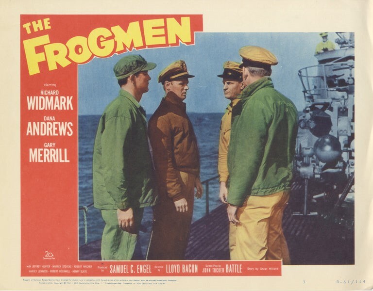 The Frogmen Original 11x14 Lobby Card 1951 Richard Widmark Dana Andrews Gary Merrill VG Condition Silver Screen Mementos are pleased to be able to offer this authentic original Lobby Card measuring 11x14 inches. This lobby card is from USA and was printed during the actual year the film was released in movie theaters. The lobby card (also known as Front of House/ FOH card in the UK) was created by the film studios to publicize the movie and was intended for display inside the movie theatre. These are NOT reproductions! You are looking at a truly original piece of cinema art, a genuine collector's item. We have a huge archive of over 250,000 original lobby cards, mostly from the 1930's to the 1980's. We will be releasing many more rare gems from our vast collection, which will include Lobby Cards, original photographs, movie stills, Original Movie Posters, transparencies, negatives, slides, magazines, brochures, press books and other movie memorabilia.