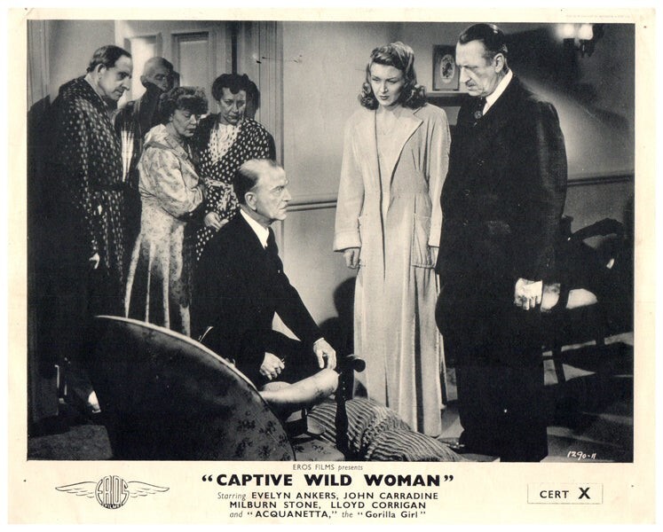 Captive Wild Woman Original Lobby Card John Carradine Evelyn Ankers Milburn Stone Lloyd Corrigan VG Condition 1943 Silver Screen Mementos are pleased to be able to offer this authentic original Lobby Card measuring 8x10 inches. This lobby card is from Great Britain and was printed during the actual year the film was released in movie theaters. The lobby card (also known as Front of House/ FOH card in the UK) was created by the film studios to publicize the movie and was intended for display outside the movie theatre in special glass display boxes. These are NOT reproductions! You are looking at a truly original piece of cinema art, a genuine collector's item. We have a huge archive of over 250,000 original lobby cards, mostly from the 1930's to the 1980's. We will be releasing many more rare gems from our vast collection, which will include lobby cards, original photographs, movie stills, magazines, brochures negatives, transparencies, slides and other collectible items of movie memorabilia.