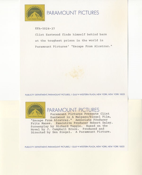 Escape From Alcatraz Clint Eastwood rugged close up Original 8x10 Photo with Snipe 1979 Near Mint Condition This item is an ORIGINAL 8x10 photo from the historic archives of Silver Screen Mementos. This original photograph was made in the actual year the film, television show or event was produced. The movie studios produced publicity photographs for distribution to the press, photo agencies and publicity departments to advertise the film/tv show or event. Very often original photos have press release information on the reverse of the photo - movie credits, description of the scene, event and people involved. This is a historic piece of cinema art and is being offered from one collector to another, no rights given or implied. Silver Screen are gradually releasing thousands of Original Photographs, Transparencies, Negatives, Lobby Cards, Posters, Magazines and other memorabilia from our historic archive.