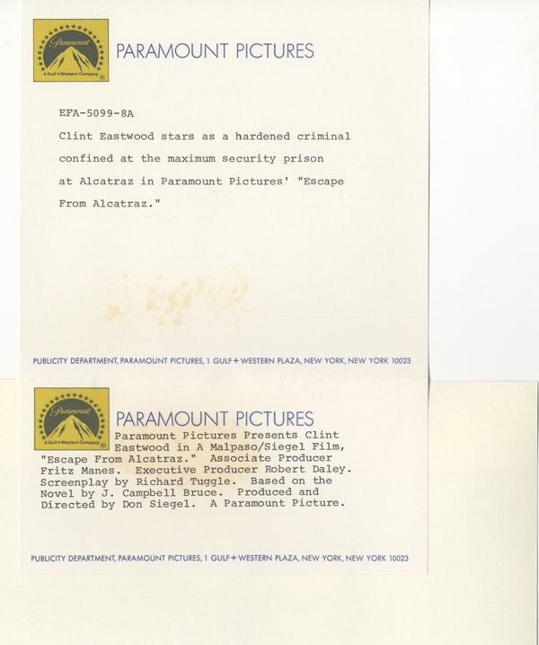 Escape From Alcatraz Clint Eastwood behind bars Original 8x10 Photo with Snipe 1979 Near Mint Condition This item is an ORIGINAL 8x10 photo from the historic archives of Silver Screen Mementos. This original photograph was made in the actual year the film, television show or event was produced. The movie studios produced publicity photographs for distribution to the press, photo agencies and publicity departments to advertise the film/tv show or event. Very often original photos have press release information on the reverse of the photo - movie credits, description of the scene, event and people involved. This is a historic piece of cinema art and is being offered from one collector to another, no rights given or implied. Silver Screen are gradually releasing thousands of Original Photographs, Transparencies, Negatives, Lobby Cards, Posters, Magazines and other memorabilia from our historic archive.