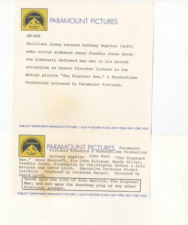 The Elephant Man Anthony Hopkins, Freddie Jones, Dexter Fletcher Original 8x10 Photo with Snipe 1980 Near Mint Condition This item is an ORIGINAL 8x10 photo from the historic archives of Silver Screen Mementos. This original photograph was made in the actual year the film, television show or event was produced. The movie studios produced publicity photographs for distribution to the press, photo agencies and publicity departments to advertise the film/tv show or event. Very often original photos have press release information on the reverse of the photo - movie credits, description of the scene, event and people involved. This is a historic piece of cinema art and is being offered from one collector to another, no rights given or implied. Silver Screen are gradually releasing thousands of Original Photographs, Transparencies, Negatives, Lobby Cards, Posters, Magazines and other memorabilia from our historic archive.