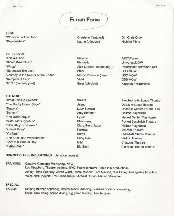 Farrah Forke Breathtaking 1990's Casting Agent Close up with Bio Sheet on back Original 8x10 Photo Good/VG Condition (bio sheet stapled at top margin) This item is an ORIGINAL 8x10 photo from the historic archives of Silver Screen Mementos. This original photograph was made in the actual year the film, television show or event was produced. The movie studios produced publicity photographs for distribution to the press, photo agencies and publicity departments to advertise the film/tv show or event. Very often original photos have press release information on the reverse of the photo - movie credits, description of the scene, event and people involved. This is a historic piece of cinema art and is being offered from one collector to another, no rights given or implied. Silver Screen are gradually releasing thousands of Original Photographs, Transparencies, Negatives, Lobby Cards, Posters, Magazines and other memorabilia from our historic archive.