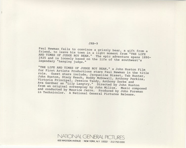 The Life and Times of Judge Roy Bean Paul Newman, Grizzzly Bear Original 8x10 Photo Stamped with Snipe 1972 Near Mint Condition This item is an ORIGINAL 8x10 photo from the historic archives of Silver Screen Mementos. This original photograph was made in the actual year the film, television show or event was produced. The movie studios produced publicity photographs for distribution to the press, photo agencies and publicity departments to advertise the film/tv show or event. Very often original photos have press release information on the reverse of the photo - movie credits, description of the scene, event and people involved. This is a historic piece of cinema art and is being offered from one collector to another, no rights given or implied. Silver Screen are gradually releasing thousands of Original Photographs, Transparencies, Negatives, Lobby Cards, Posters, Magazines and other memorabilia from our historic archive.