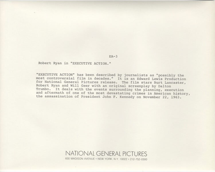 Executive Action Robert Ryan JFK Assassination Original 8x10 Photo Stamped with Snipe 1973 Near Mint Condition This item is an ORIGINAL 8x10 photo from the historic archives of Silver Screen Mementos. This original photograph was made in the actual year the film, television show or event was produced. The movie studios produced publicity photographs for distribution to the press, photo agencies and publicity departments to advertise the film/tv show or event. Very often original photos have press release information on the reverse of the photo - movie credits, description of the scene, event and people involved. This is a historic piece of cinema art and is being offered from one collector to another, no rights given or implied. Silver Screen are gradually releasing thousands of Original Photographs, Transparencies, Negatives, Lobby Cards, Posters, Magazines and other memorabilia from our historic archive.